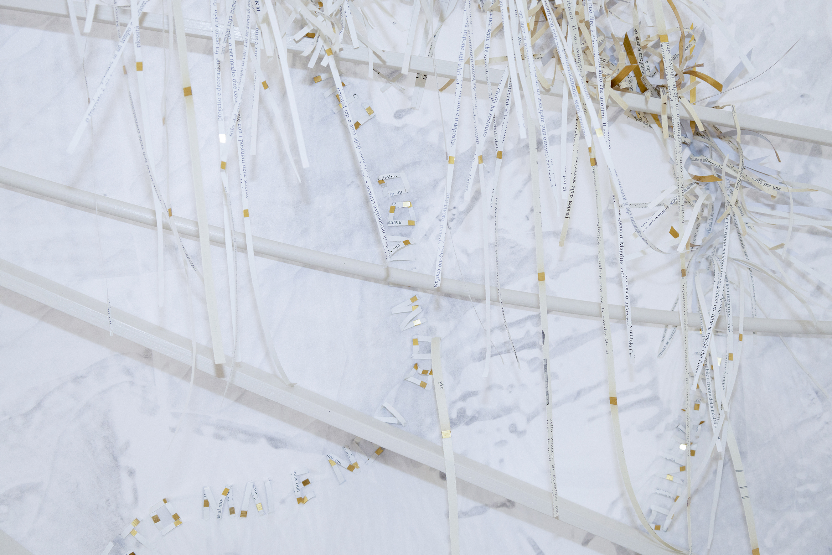 photographic contact print on silk, pages from books, gilded aluminium, 300 x 150 cm
